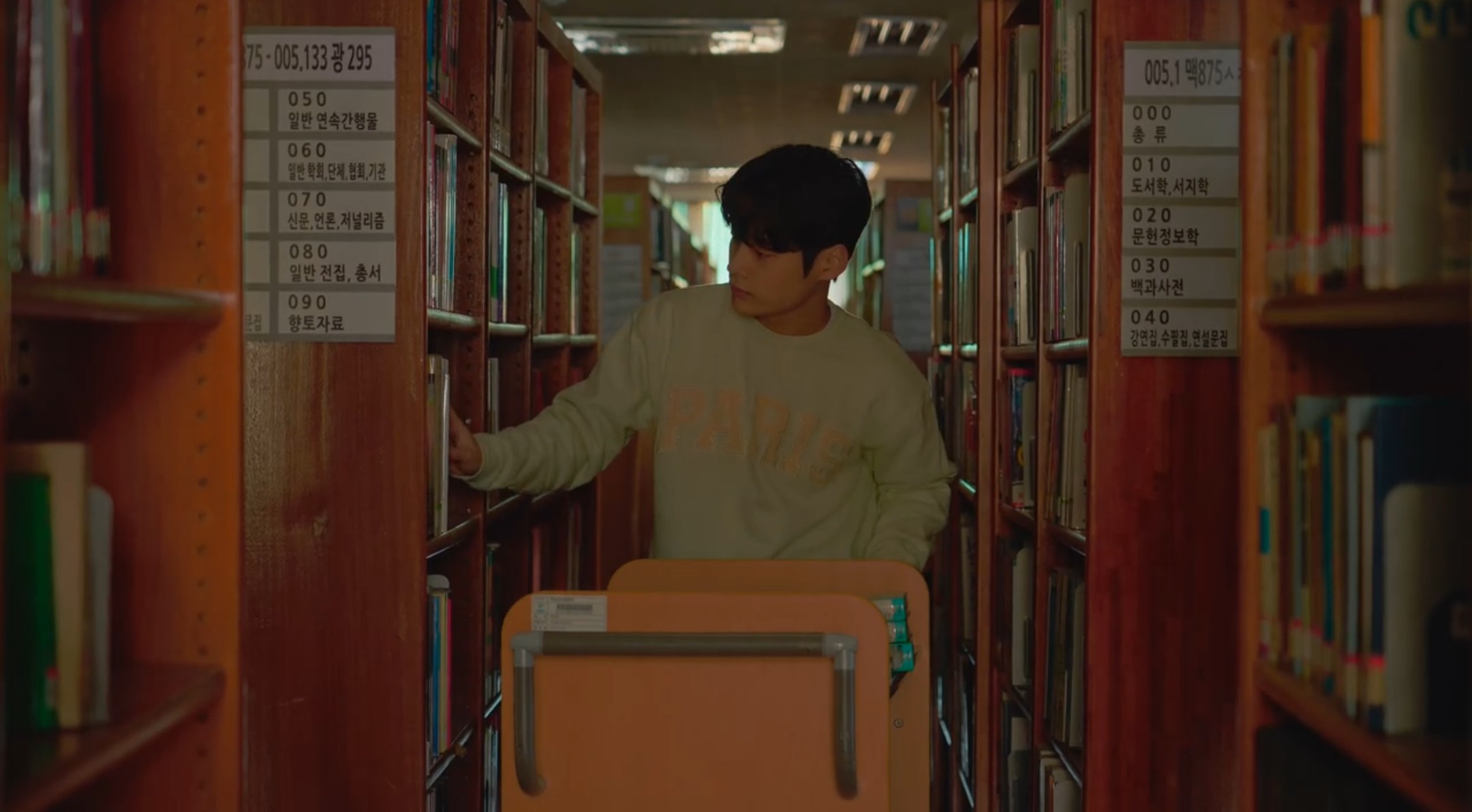 Min Jae spends most of his time working part-time jobs, including at the library (a setting that also feels very on-season). He’s fine with focusing on work and school without worrying about friendships.