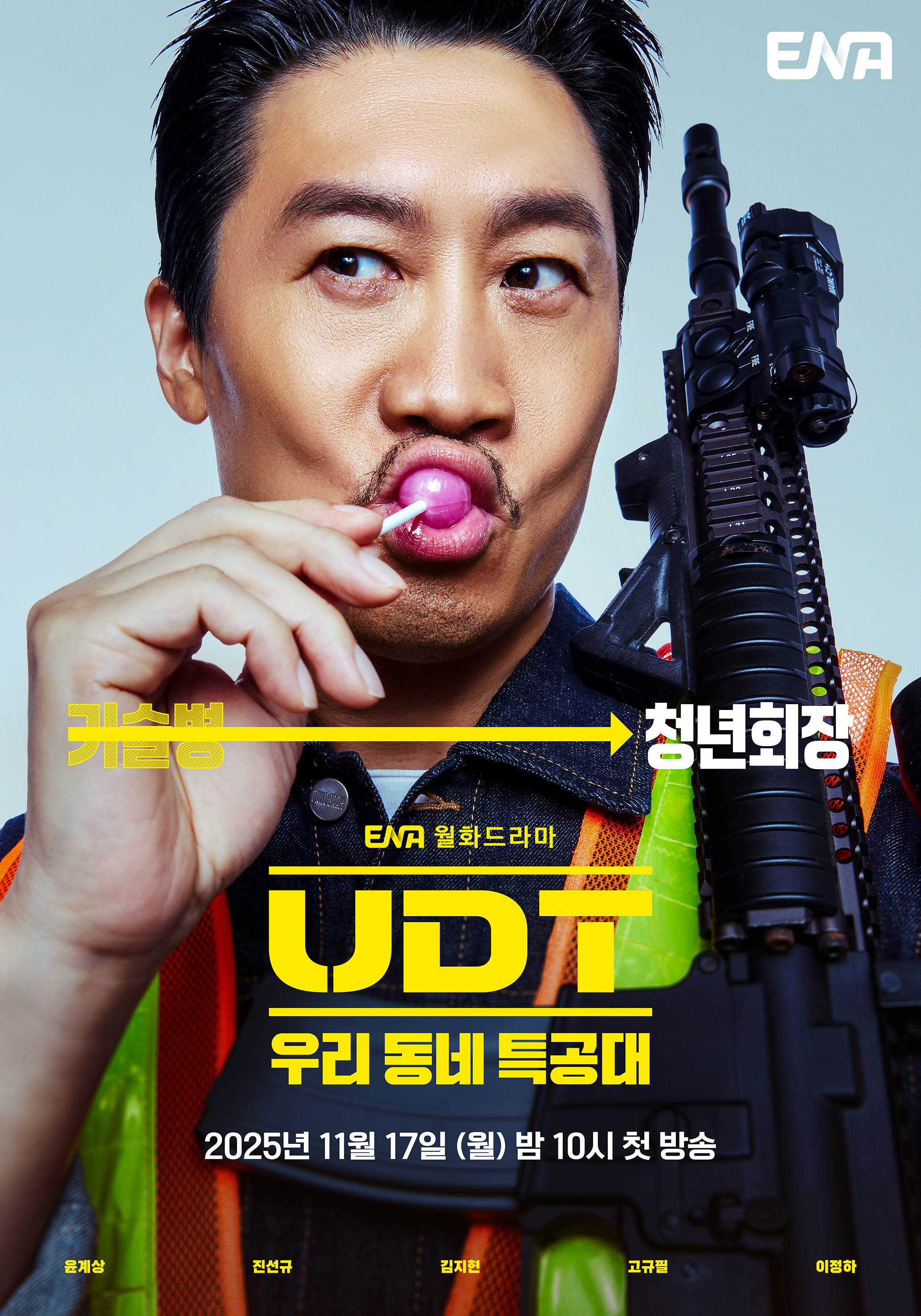 Next is Kwak Byung Nam (Jin Sun Kyu), once a technical specialist soldier and now the head of the local youth association. With a lollipop in his mouth and a mischievous grin, he holds a machine gun in a scene that mixes tension and humor. His blend of wit and intensity hints at surprising twists.